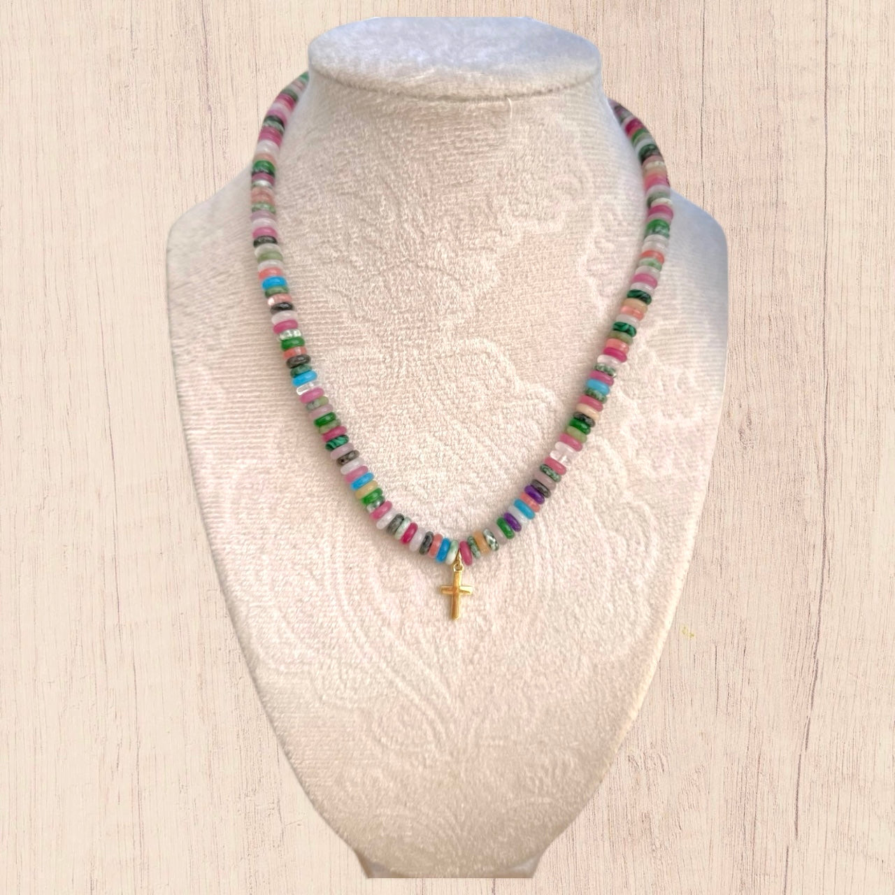 Natural gemstones, gold plated stainless steel. Approximately 16” + 4” extender