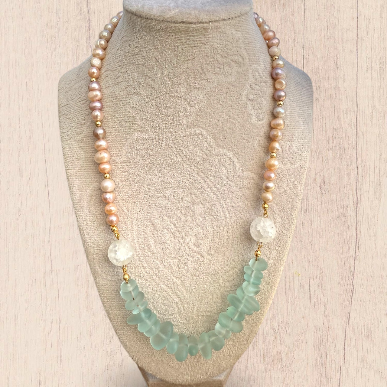 Natural pearls, quartz and glass beads, gold plated stainless steel. Approximately 20” + chain extender