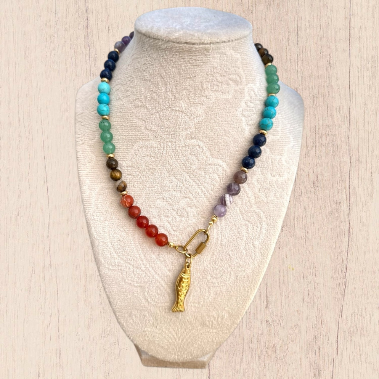 Natural gemstones, gold plated stainless steel, carabiner clip for charms. Approximately 17” + 2” chain extender