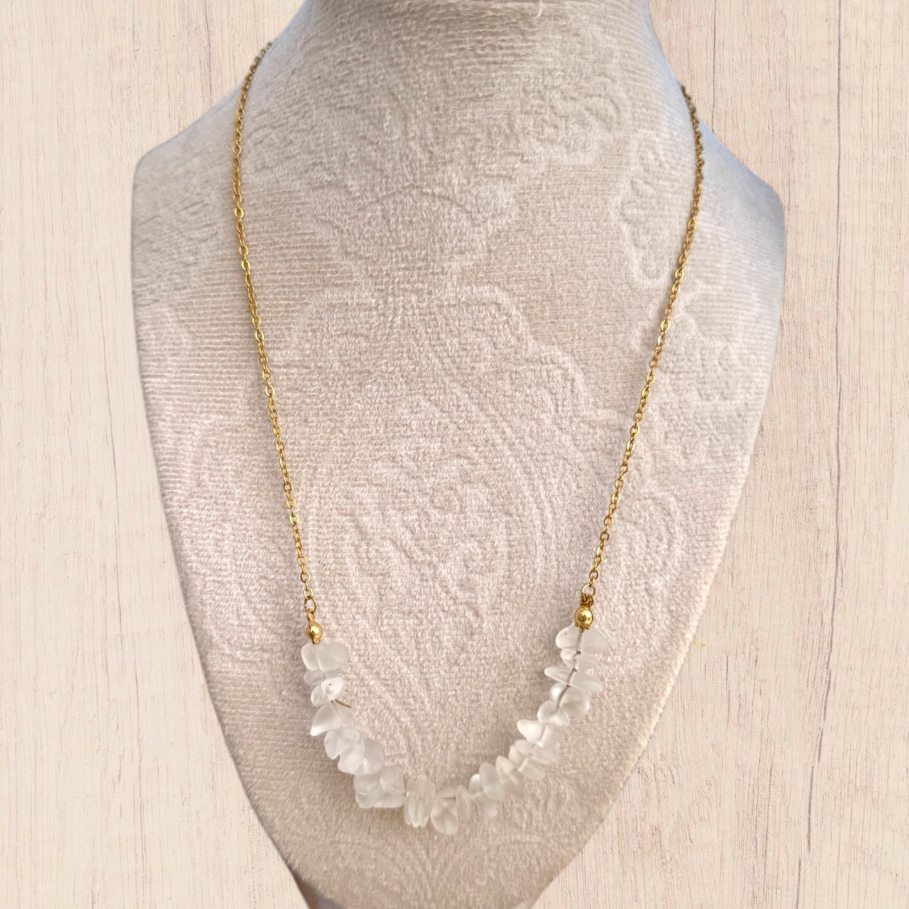 Clear quartz stones and gold plated stainless steel. Approximately 20”