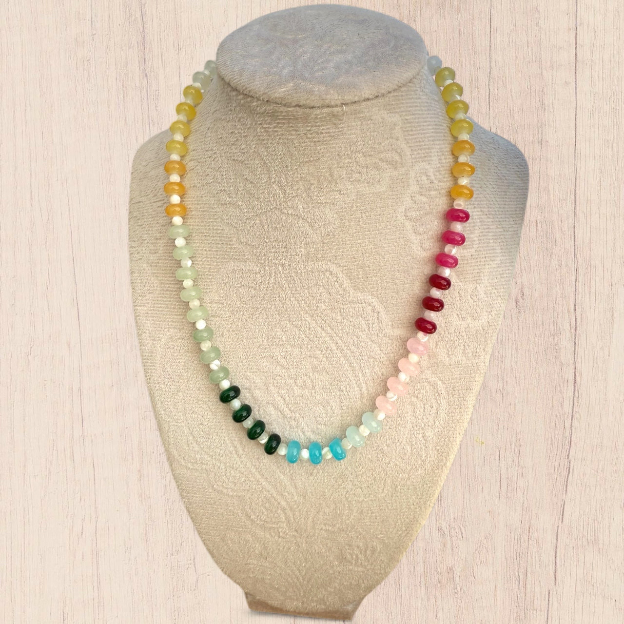 Glass beads & mother of pearl, gold plated stainless steel, toggle clasp. Approximately 18”