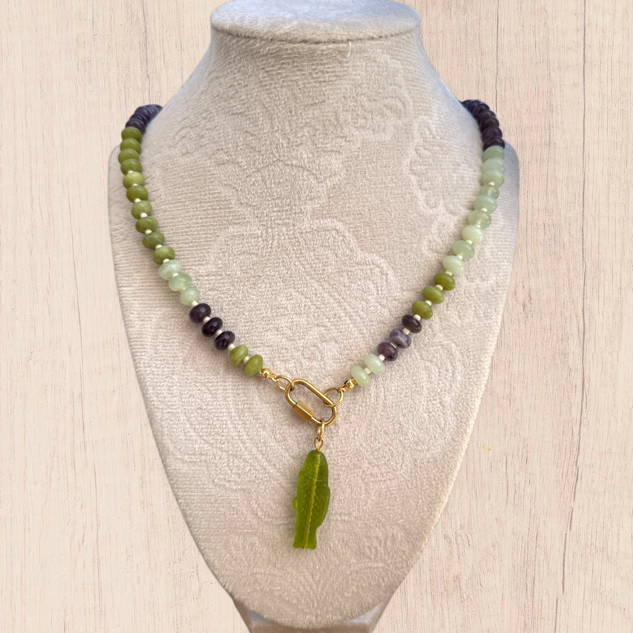 Natural gemstones and glass beads, gold plated stainless steel, carabiner clip for charms. Approximately 20”, toggle clasp
