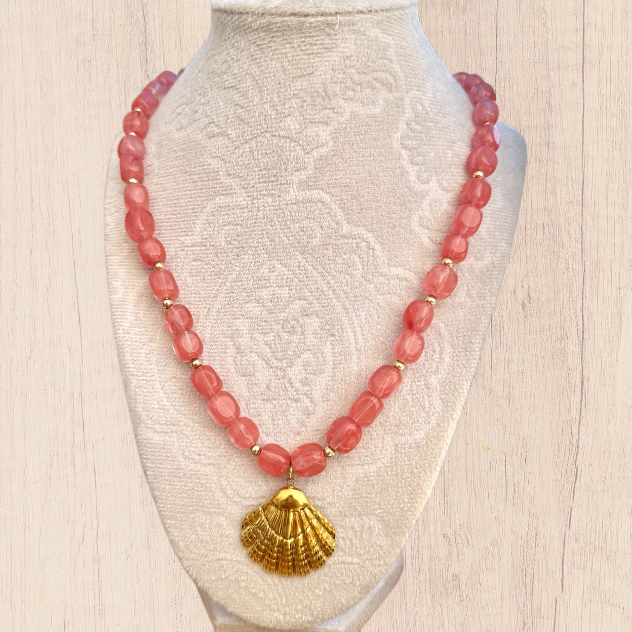Cherry quartz, gold plated stainless steel. Approximately 19” + chain extender