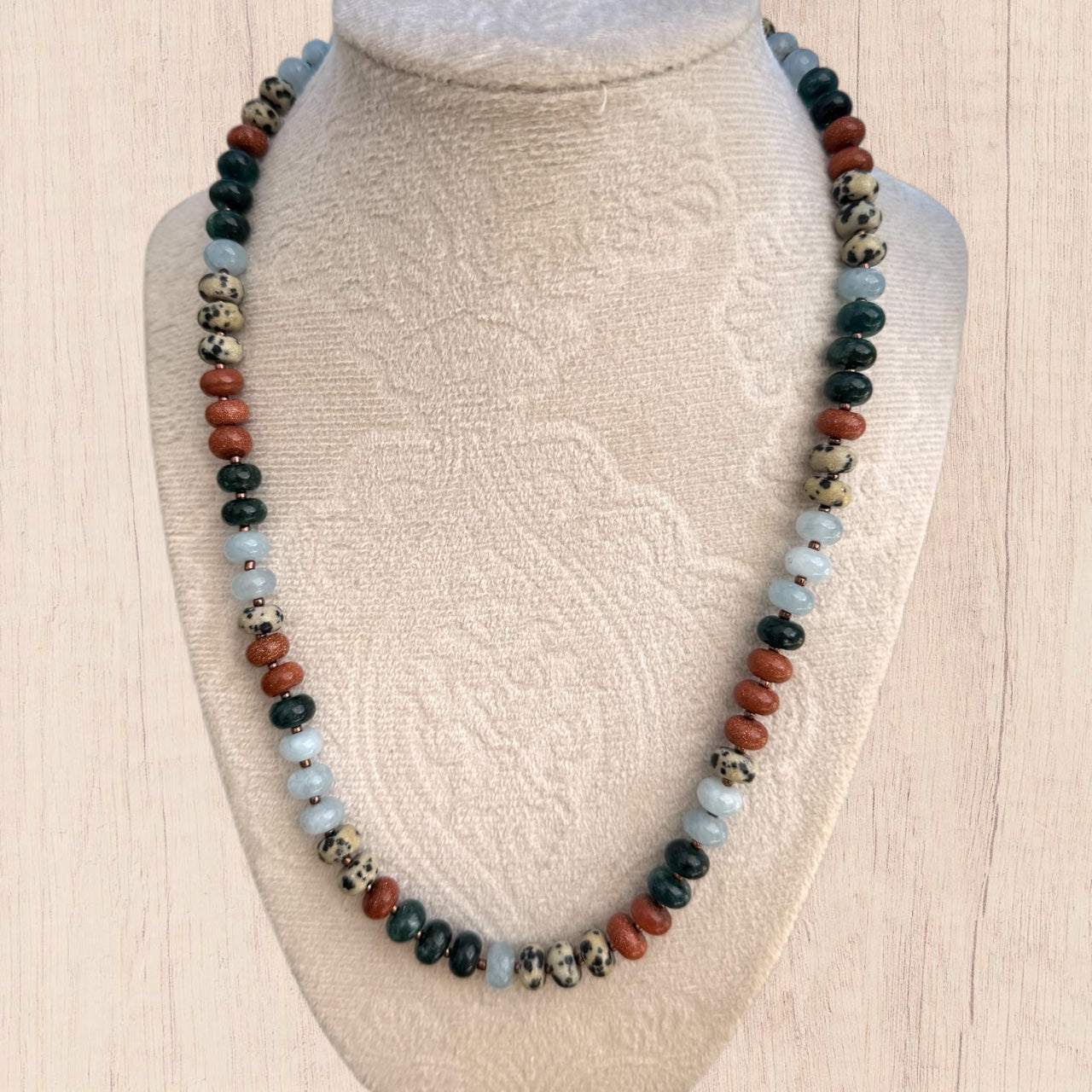 Natural gemstones, gold plated stainless steel. Approximately 18” + chain extender